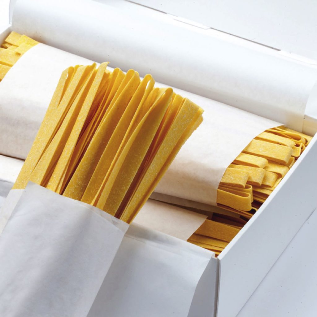 Our artisan producers make just 50kg of dried pasta per day from their tiny workshop in the Marche region of Italy. Using a variety of local wheats and super fresh free range eggs for each product, the pasta is hand-kneaded then rolled out on a small machine, cut by hand and then hung to dry slowly in low temperatures for a natural drying process. The final step is packing into fine handmade boxes. The resulting pasta has a rough texture and a bright egg colour, which on eating is light and fragrant.